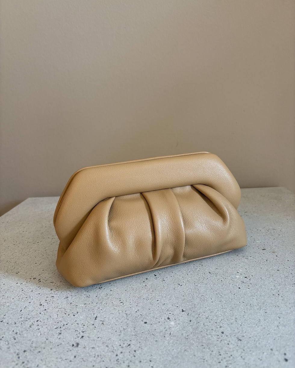 Kompaktna clutch torba meke strukture s lagano naboranim dizajnom. Dolazi s odvojivim zlatnim lančićem za nošenje preko tijela. Praktična za svakodnevne kombinacije i večernje izlaske.